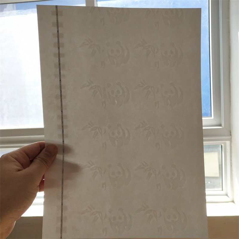 水印紙采用特殊化學樹脂及特殊印刷方式制作,使樹脂滲透紙張,改變紙張透光率,透光目測時產生明暗有別的預定水印圖案。